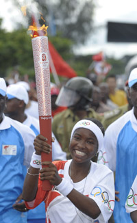 4月13日,坦桑尼亞火炬手穆絲塔法·妲米麗手持火炬?zhèn)鬟f。23歲的坦桑尼亞女孩穆絲塔法·妲米麗是參加北京奧運(yùn)火炬在達(dá)累斯薩拉姆傳遞活動(dòng)的火炬手中惟一一位艾滋病病毒攜帶者。