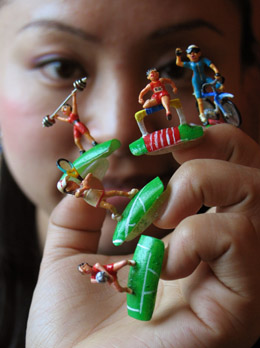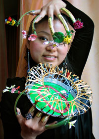 日前,南京美甲造型師金玉耗時(shí)兩個(gè)多月設(shè)計(jì)創(chuàng)作了一組奧運(yùn)主題美甲作品。這組作品共有20多件,用水晶粉等美甲材料制成,包括福娃、可活動(dòng)的體育人物、奧運(yùn)場(chǎng)館等系列。圖為金玉在展示“奧運(yùn)美甲”作品。 |