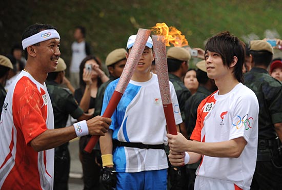| 4月21日,奧運火炬手在傳遞過程中進(jìn)行交接。新華社記者 安治平