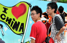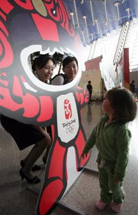 5月1日,青少年在塔石廣場上觀看迎接北京奧運會的“創(chuàng)意涂鴉大比拼”作品。當日,中國澳門特區(qū)在塔石廣場舉辦“中國澳門青年喜迎2008北京奧運”活動,逾萬名中學(xué)生及當?shù)鼐用駞⑴c到活動當中。