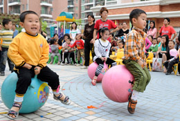 各種形式的趣味運動會近日在福州市的社區(qū)陸續(xù)展開,人們以歡快活潑的趣味比賽迎奧運。圖為福州金山吉龍社區(qū)的小朋友在社區(qū)趣味運動會中進行跳球接力比賽。