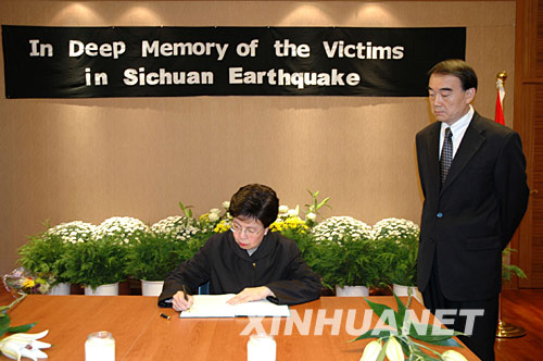 5月20日,在瑞士日內(nèi)瓦,世界衛(wèi)生組織總干事陳馮富珍前往中國常駐日內(nèi)瓦聯(lián)合國代表團駐地,吊唁中國汶川大地震遇難者,并稱贊中國的救災(zāi)工作高效透明。