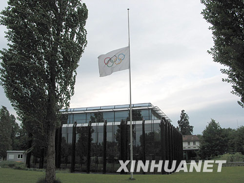 5月20日,瑞士洛桑國際奧委會總部前的五環(huán)旗降半旗向中國汶川大地震遇難者志哀。