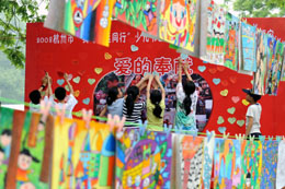 5月25日,小朋友把寫有給災(zāi)區(qū)孩子寄語的紙條貼在簽名墻上。當(dāng)日,杭州市舉辦“我與奧運同行”少兒書畫攝影創(chuàng)意大賽優(yōu)秀作品展示暨賑災(zāi)義賣活動,近500幅參賽作品和部分獲獎選手現(xiàn)場創(chuàng)作的作品參加義賣,所得款項將捐給四川地震災(zāi)區(qū)的孩子。
