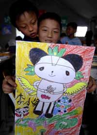 一名小學(xué)生在位于綿陽市九洲體育館的帳篷小學(xué)內(nèi)展示自己創(chuàng)作的以奧運為題材的繪畫作品。