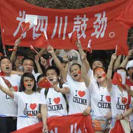 5月23日,群眾沿途為災(zāi)區(qū)人民鼓勁。當(dāng)日,北京奧運會圣火在上海傳遞。