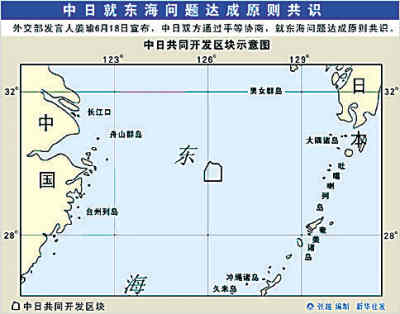 外交部發(fā)言人姜瑜18日宣布,中日雙方通過(guò)平等協(xié)商,就東海問(wèn)題達(dá)成原則共識(shí)。 一、關(guān)于中日在東海的合作 為使中日之間尚未劃界的東海成為和平、合作、友好之海,中日雙方根據(jù)2007年4月中日兩國(guó)領(lǐng)導(dǎo)人達(dá)成的共識(shí)以及2007年12月中日兩國(guó)領(lǐng)導(dǎo)人達(dá)成的新共識(shí),經(jīng)過(guò)認(rèn)真磋商,一致同意在實(shí)現(xiàn)劃界前的過(guò)渡期間,在不損害雙方法律立場(chǎng)的情況下進(jìn)行合作。為此,雙方邁出了第一步,今后將繼續(xù)進(jìn)行磋商。 二、中日關(guān)于東海共同開發(fā)的諒解 作為中日在東海共同開發(fā)的第一步,雙方將推進(jìn)以下步驟: 。ㄒ唬┯梢韵赂髯鴺(biāo)點(diǎn)順序連線圍成的區(qū)域?yàn)殡p方共同開發(fā)區(qū)塊(見上圖): 北緯29°31′,東經(jīng)125°53′30″;北緯29°49′,東經(jīng)125°53′30″;北緯30°04′,東經(jīng)126°03′45″;北緯30°00′,東經(jīng)126°10′23″;北緯30°00′,東經(jīng)126°20′00″;北緯29°55′,東經(jīng)126°26′00″;北緯29°31′,東經(jīng)126°26′00″ 。ǘ╇p方經(jīng)過(guò)聯(lián)合勘探,本著互惠原則,在上述區(qū)塊中選擇雙方一致同意的地點(diǎn)進(jìn)行共同開發(fā)。具體事宜雙方通過(guò)協(xié)商確定。(三)雙方將努力為實(shí)施上述開發(fā)履行各自的國(guó)內(nèi)手續(xù),盡快達(dá)成必要的雙邊協(xié)議。(四)雙方同意,為盡早實(shí)現(xiàn)在東海其它海域的共同開發(fā)繼續(xù)磋商。 三、關(guān)于日本法人依照中國(guó)法律參加春曉油氣田開發(fā)的諒解 中國(guó)企業(yè)歡迎日本法人按照中國(guó)對(duì)外合作開采海洋石油資源的有關(guān)法律,參加對(duì)春曉現(xiàn)有油氣田的開發(fā)。 中日兩國(guó)政府對(duì)此予以確認(rèn),并努力就進(jìn)行必要的換文達(dá)成一致,盡早締結(jié)。雙方為此履行必要的國(guó)內(nèi)手續(xù)。 |