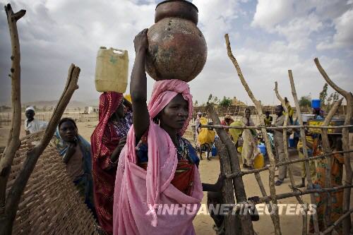 6月19日,在乍得東部的一個(gè)難民營(yíng),來(lái)自達(dá)爾富爾地區(qū)的幾名難民頂著罐子前往井中取水。