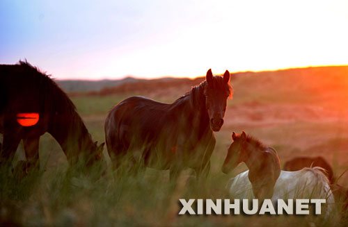 6月23日,馬匹在錫林郭勒輝騰梁草原上食草。