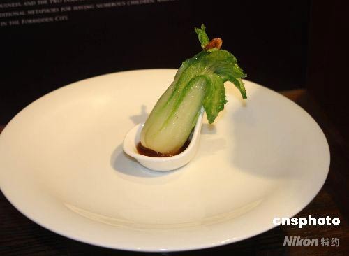 圖為“國寶宴”第一道菜“翠玉白菜”,選用產(chǎn)自臺灣中部的娃娃菜,整棵菜剝掉百分之九十,只取小小的菜心、長約八到十公分大小。先經(jīng)過火腿、雞高湯汆燙入味,之后可以淋上XO高湯醬汁熱食,或搭配咸甜的芝麻醬汁當(dāng)開胃冷食。珍寶原件的翡翠白菜上有蟈蟈,主廚就在迷你白菜上放一只櫻花蝦替代,食趣十足。