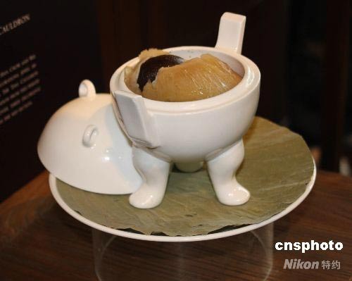 圖為戰(zhàn)國時代青銅器的代表作“弦紋鼎”,被仿制成白瓷容器,盛裝閩菜之首“佛跳墻”。