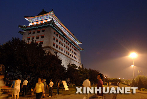 入夜,市民在北京城東南角樓下散步(7月7日攝)。