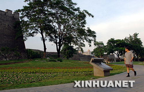 | 一位市民在北京明城墻遺址公園散步(7月7日攝)。 |