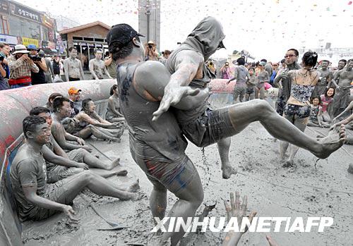 7月13日,在韓國保寧大川海水浴場舉行的泥漿節(jié)上,游客們在泥漿中嬉戲。保寧每年舉行泥漿節(jié)吸引游客,游客可以將泥漿涂抹在身上美容護膚。 新華社/法新