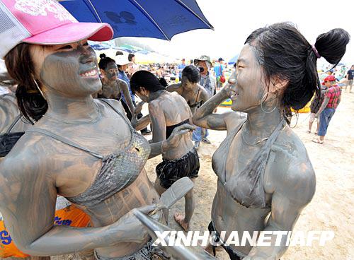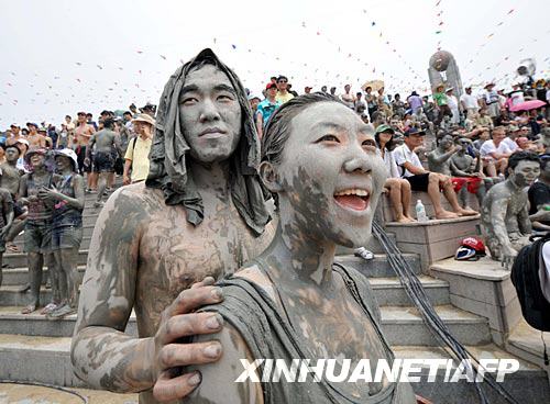 7月13日,在韓國保寧大川海水浴場舉行的泥漿節(jié)上,游客們將泥漿涂抹在身上。新華社/法新