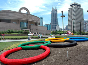 | 迎奧運五環(huán)花壇亮相上海人民廣場。新華社發(fā)(高曉天攝) |