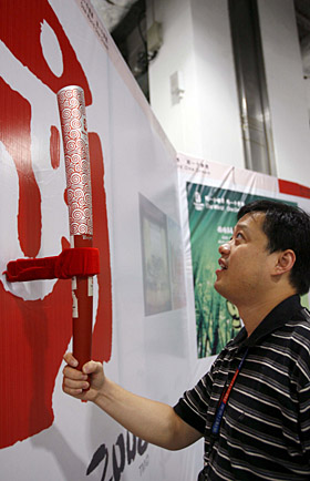 | 在奧林匹克珍藏品中國巡展上海站上,一位參觀者在觸摸“祥云”火炬。新華社記者 凡軍 攝 |