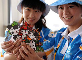 | 志愿者在秦皇島奧體中心展示福娃粘貼畫。新華社記者 楊世堯