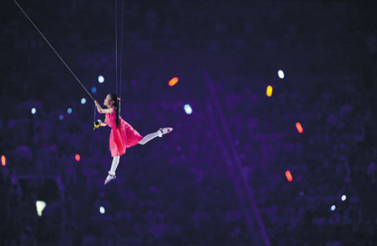 在北京奧運(yùn)會(huì)的開(kāi)幕式上,一個(gè)小女孩兒的出現(xiàn)讓整場(chǎng)演出增添了童趣和浪漫。她就是那個(gè)放著風(fēng)箏從“星星鳥(niǎo)巢”上空緩緩飛過(guò)的小姑娘朱巧妍。 即將在這個(gè)月過(guò)9歲生日的小巧妍在雜技界也算是一員“老將”了,來(lái)自安徽淮南的小女孩兒5歲便來(lái)到沈陽(yáng)軍區(qū)雜技團(tuán)學(xué)習(xí)。正是這四年的學(xué)習(xí)生涯為她在“鳥(niǎo)巢”上空自然、淡定的表演奠定了基礎(chǔ)。 其實(shí)小巧妍第一次被吊到半空的時(shí)候也害怕,那是因?yàn)樵谘莩鲋,她手中的“風(fēng)箏”和她自己是分別被固定在兩個(gè)不同的點(diǎn)上的,有的時(shí)候兩個(gè)“點(diǎn)”走起來(lái)不同步,她幼小的身體就會(huì)被慣性拽得搖搖晃晃,雖然保護(hù)措施非常嚴(yán)密,不會(huì)出現(xiàn)危險(xiǎn),但在空中晃來(lái)晃去,別說(shuō)是一個(gè)小女孩兒,就是一個(gè)大人也受不了。 小巧妍非?斓鼐瓦m應(yīng)了這種高空表演,再第一次被吊到半空,稍微調(diào)整了心情之后,小巧妍居然還調(diào)皮地翻起了跟頭,這可讓創(chuàng)意團(tuán)隊(duì)的叔叔阿姨們跌破了眼鏡,這個(gè)角色非她莫屬啊。第一次訓(xùn)練,短短10分鐘,小巧妍征服了所有人,完成了一個(gè)成年人或許苦練很長(zhǎng)時(shí)間才能完成的任務(wù)。 在張藝謀的設(shè)想中,這個(gè)小女孩兒的出場(chǎng)一定要親切、自然、生活化,不能有表演的痕跡,小巧妍在叔叔阿姨們耐心地輔導(dǎo)下,終于放下了心理包袱,將這段演出完全當(dāng)成了一次游戲,正是這樣,這場(chǎng)演出才達(dá)到了預(yù)期的效果。 小巧妍很樂(lè)觀,雖然皮膚被曬得黑黑的,但她在排練期間從來(lái)不說(shuō)苦,不說(shuō)累,在排練場(chǎng),小巧妍也給其他演員帶來(lái)了歡樂(lè),每次她回到地面,總會(huì)有其他的叔叔阿姨過(guò)來(lái)跟她一起玩兒,跟她合影。為了保護(hù)小巧妍稚嫩的身體,開(kāi)幕式空中特技表演總設(shè)計(jì)程小東親自出馬,為小巧妍量身設(shè)計(jì)了一套舒適、貼身的防護(hù)裝備,這樣,鋼絲就不會(huì)勒傷這位大家心目中的小天使。 小巧妍也許是唯一一個(gè)能從空中“星星鳥(niǎo)巢”的演員了,她告訴我們,地上的“鳥(niǎo)巢”很美。