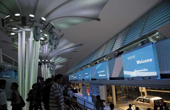 2008年8月9日,在文德恩教授致詞后,大眾汽車的奧林匹克主題館迎來了它的第一批嘉賓。這個與鳥巢遙相呼應,承載著大眾汽車奧運夢想的開放式場館正式點燃了激情。 據(jù)大眾汽車集團(中國)市場部總監(jiān)胡波先生介紹,這一主題館是15家贊助商主題場館中惟一的開放式建筑,一方面為了體現(xiàn)大眾汽車透明、開放的企業(yè)文化,另一方面也希望帶給參觀者更多與自然接觸的機會。雖然只是一個使用兩個月的臨時建筑,并且據(jù)大眾汽車估算,每一名參觀者只會在其中逗留15到20分鐘左右,但是大眾汽車卻專門請來德國設計事務所進行設計,并由一家駐上海的德國公司進行施工。據(jù)胡波先生透露,這一次的投入幾乎與一次A級車展相同,但他同時表示,這一場館絕不會成為汽車展示廳,而是展現(xiàn)品牌、企業(yè)文化與奧林匹克精神相結(jié)合的一個舞臺。 胡波先生介紹說,在場館上方是戶外70米長的太陽能背景墻與9塊可移動式LED屏的結(jié)合運用。在奧運期間,主題館內(nèi)會進行每場20分鐘左右的循環(huán)表演,不僅屏幕上會播出一些影片,而且會有特技演員與屏幕進行互動式表演。在奧運比賽的重要時刻大屏幕會進行現(xiàn)場直播,讓每一名參觀者時刻感受著奧運的氣息。