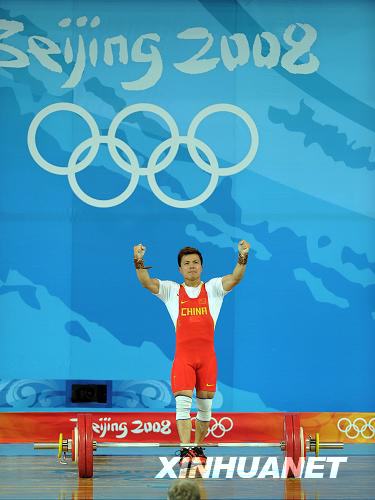8月11日,中國選手張湘祥慶祝成功。當日,張湘祥在北京奧運會舉重男子62公斤級決賽中以319公斤的總成績獲得金牌。新華社記者楊磊/攝