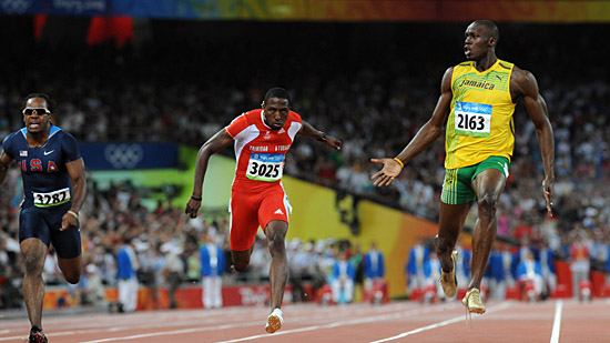 一股黑色旋風(fēng)瞬間掠過“鳥巢”的紅色跑道,牙買加“奇人”博爾特最終用實(shí)力證明他是世界上跑得最快的人。 16日晚,在全場驚爆的歡呼聲中,他僅用了9秒69的時(shí)間到達(dá)了100米跑道的終點(diǎn),并刷新了自己2個(gè)多月前創(chuàng)下的9秒72的世界紀(jì)錄,一舉奪得北京奧運(yùn)會(huì)男子100米冠軍。 特立尼達(dá)和多巴哥的湯普森以9秒89摘得銀牌;美國人迪克斯贏得銅牌,成績?yōu)?秒91。 16日晚在“鳥巢”內(nèi)上演的“飛人大戰(zhàn)”決賽,幾乎成了博爾特一個(gè)人的表演。而就在兩個(gè)多月前,博爾特剛以9秒72打破了鮑威爾9秒74的世界紀(jì)錄。 在半決賽中跑出9秒85的博爾特,當(dāng)晚站在“飛人大戰(zhàn)”決賽第4道。決賽中,22歲的博爾特并未給對(duì)手以機(jī)會(huì),如同離弦之箭第一個(gè)沖向百米跑道的終點(diǎn)。 他的同胞、前世界紀(jì)錄保持者鮑威爾則排名第五,成績?yōu)?秒95。 半決賽16位選手中,有6位跑進(jìn)了10秒大關(guān),進(jìn)入男子100米決賽的門檻為10秒03。賽前的奪冠熱門、美國“飛人”蓋伊在半決賽中僅跑出10秒05的成績,排位小組第五,無奈憾別“飛人大戰(zhàn)”決賽跑道。