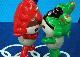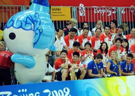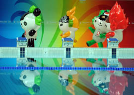 8月17日,福娃為選手助威。當(dāng)日,北京奧運會女子3米跳板決賽在國家游泳中心——“水立方”舉行。