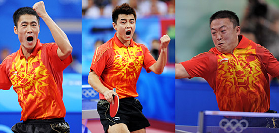 中國(guó)乒乓球隊(duì)18日晚改寫歷史,于北京奧運(yùn)會(huì)乒乓球男子團(tuán)體決賽中3:0擊敗德國(guó)隊(duì),奪得國(guó)球歷史上的第18枚奧運(yùn)金牌。 四年前在雅典,張怡寧為中國(guó)代表團(tuán)摘得第一百枚夏季奧運(yùn)會(huì)金牌,而王皓卻決賽負(fù)于柳承敏,丟掉分量最重的男單冠軍;四年后奧運(yùn)來到北京,中國(guó)乒乓球隊(duì)在自己的家門口續(xù)寫輝煌。 這也是世界杯冠軍王皓的第一塊奧運(yùn)會(huì)金牌。2000年悉尼奧運(yùn)會(huì)上,王勵(lì)勤與閻森搭檔曾奪得一枚男子雙打金牌;馬琳則與陳?配對(duì),在2004年雅典奧運(yùn)會(huì)上擊敗中國(guó)香港的李靜/高禮澤,獲得男雙冠軍。 有了這枚男團(tuán)金牌,兩年前在同一天完成人生另一個(gè)重大典禮的國(guó)乒男隊(duì)主教練劉國(guó)梁,也為曾經(jīng)同是乒乓球國(guó)手的妻子王瑾獻(xiàn)上了最好的結(jié)婚紀(jì)念日禮物。 18日晚的決戰(zhàn)中,劉郎妙計(jì)再生威,王皓打頭陣、馬琳“捉”波爾的布陣效果頗佳,王勵(lì)勤/王皓的雙打?qū)嵙τ肿銐蚨糁撇?許斯。在中國(guó)組合面前,這對(duì)贏得過世乒賽亞軍的“歐洲第一雙打”只搶到首局機(jī)會(huì),以13:11、5:11、8:11、7:11告負(fù)。 其實(shí),在鉆石級(jí)強(qiáng)手面前,是金子也會(huì)被掩去光芒。當(dāng)奧恰洛夫遇見當(dāng)今世界男乒第一人王皓,這位未滿20歲的歐洲新星幾乎沒機(jī)會(huì)表現(xiàn),“潛水艇”式發(fā)球產(chǎn)生的積極效果有限,反手優(yōu)勢(shì)也變成對(duì)手眼里的小菜一碟,11:4、11:8、11:7的三局比分輕松吞噬了奧恰洛夫的雄心。 和兩天前半決賽上對(duì)陣韓國(guó)隊(duì)時(shí)極為相似地,中國(guó)隊(duì)決賽中的唯一波折也發(fā)生在馬琳身上。對(duì)陣“歐洲第一人”波爾的第二局中,11:7先下一城的馬琳在急于取勝的焦躁心態(tài)驅(qū)使下自亂陣腳、連連失誤,白送波爾一個(gè)7:1領(lǐng)先的完美開局,雖然馬琳稍后重拾穩(wěn)定發(fā)揮,號(hào)稱“世界第一細(xì)膩”的前三板優(yōu)勢(shì)也屢屢發(fā)揮效用,但在波爾對(duì)其反手的一通連續(xù)猛攻之后,馬琳以8:11失掉了一局。 接下來的兩局中馬琳持續(xù)穩(wěn)健表現(xiàn),在11:4輕取第三局后,又在第四局中以7:5領(lǐng)先,劉國(guó)梁這時(shí)及時(shí)暫停布置戰(zhàn)術(shù),雖然暫;貋砗篑R琳先讓波爾扳回兩分,但此后的一系列攻防則沒讓對(duì)手抓到一點(diǎn)機(jī)會(huì),最后一記勢(shì)大力沉的扣殺甚至讓波爾右手著地險(xiǎn)些跪倒,11:7鎖定勝局。
