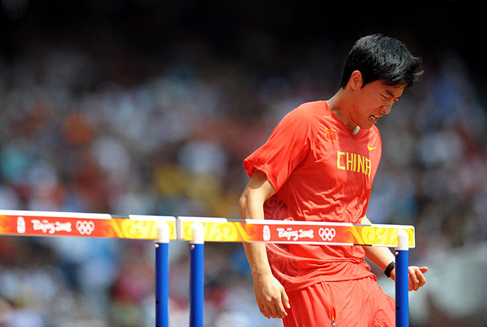8月18日,中國選手劉翔在比賽前進(jìn)行上場準(zhǔn)備時感到不適。當(dāng)日,劉翔在北京奧運會男子110米欄第一輪比賽中,因為腳跟之傷退出比賽。