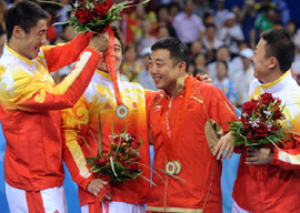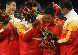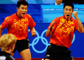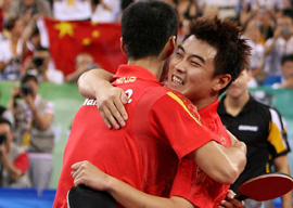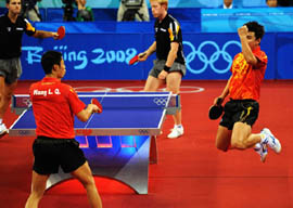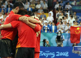 8月18日,中國隊在北京奧運會乒乓球男子團體決賽中以3比0戰(zhàn)勝德國隊,摘得金牌。