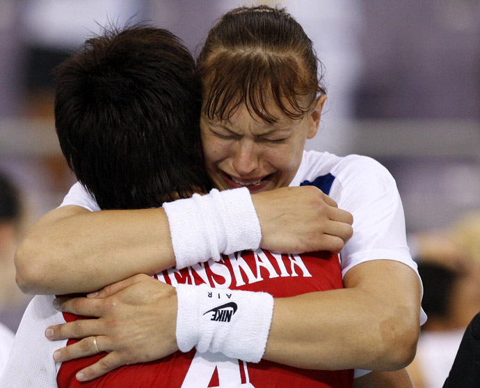 8月19日,俄羅斯隊球員葉連娜·波列諾娃在賽后喜極而泣。當日,在北京奧體中心體育館舉行的北京奧運會女子手球四分之一決賽中,經過兩場加時賽,俄羅斯隊以32比31戰(zhàn)勝法國隊,晉級四強。