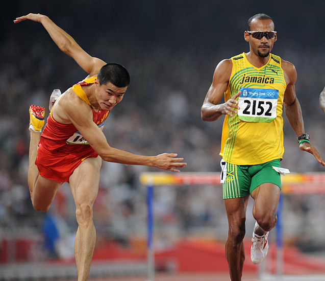8月20日,中國選手史冬鵬(左)在男子110米欄半決賽中。史冬鵬名列小組第五名,無緣決賽。當(dāng)日,北京奧運(yùn)會(huì)田徑比賽在國家體育場(chǎng)“鳥巢”繼續(xù)進(jìn)行。