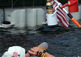 北京奧運會馬拉松游泳比賽在順義奧林匹克水上公園的直道水道上往返進行,在兩頭的轉彎處都設有“補給站”——一個巨大的固定在岸邊的塑料筏子。教練們站在筏子上把食物、飲料裝在瓶子里挑在竿頭,懸在選手經過的水道上空,樣子很像是在釣魚。 一些選手經過“補給站”時,伸手取下瓶子,吃上幾口就把瓶子扔在水里。有的人拿到瓶子后還沒吃到嘴,就被別人打掉在水里。不過,因為害怕耽誤時間或喪失優(yōu)勢位置,大多數選手都沒有伸手取物。此外,不少選手都在泳衣縫里別上小號的塑料包裝食品或者飲料。
