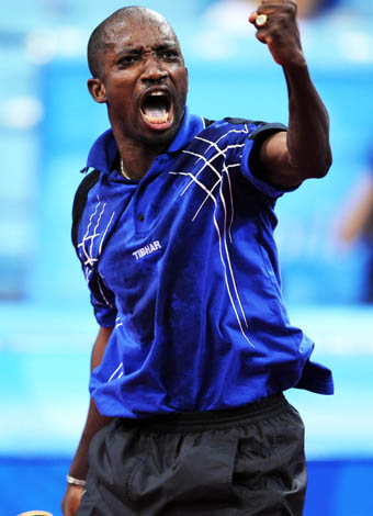 8月20日,尼日利亞選手塞貢·托里奧拉在比賽中歡呼。當日,托里奧拉在北京奧運會乒乓球男子單打第二輪中以4比2戰(zhàn)勝比利時名將大塞弗,晉級下一輪。