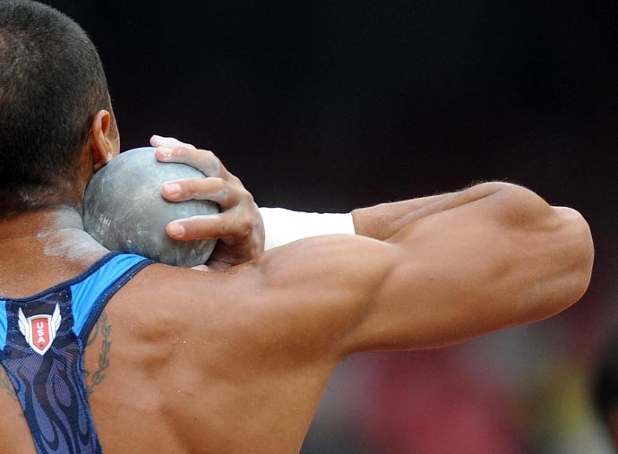 8月22日,美國選手布賴恩·克萊以8791分的成績奪得北京奧運會男子十項全能比賽金牌。圖為8月21日布賴恩·克萊在男子十項全能鉛球比賽中。