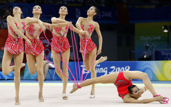 中國(guó)藝術(shù)體操新的歷史24日在北京工業(yè)大學(xué)體育館書(shū)寫(xiě)。中國(guó)姑娘們?cè)趭W運(yùn)會(huì)藝術(shù)體操比賽中,以35.225分歷史性地奪得集體全能銀牌,這也是中國(guó)藝術(shù)體操的首枚奧運(yùn)會(huì)獎(jiǎng)牌。 實(shí)力超群的俄羅斯隊(duì)以35.550分奪得金牌,再次包攬奧運(yùn)會(huì)藝術(shù)體操兩金。白俄羅斯隊(duì)以34.900分奪得銅牌。 北京奧運(yùn)會(huì)藝術(shù)體操項(xiàng)目設(shè)個(gè)人全能和集體全能兩枚金牌。此前,中國(guó)藝術(shù)體操的歷史最好成績(jī)是亞特蘭大奧運(yùn)會(huì)的第五名。24日的決賽中,中國(guó)藝術(shù)體操姑娘們?cè)诩议T(mén)口大放異彩。她們動(dòng)作編排精美,整體配合默契,在首輪5繩比賽中,就奪得第三名,超過(guò)主要競(jìng)爭(zhēng)對(duì)手意大利隊(duì)0.575分。 次輪3圈+2棒的比賽中,伴著京劇傳統(tǒng)音樂(lè)開(kāi)場(chǎng),中國(guó)姑娘們時(shí)而如飛鳥(niǎo)凌空展翅,時(shí)而如孔雀驚艷開(kāi)屏,甜美的笑容打動(dòng)了全場(chǎng)觀(guān)眾?胺Q(chēng)完美的表現(xiàn)令中國(guó)隊(duì)得分超過(guò)白俄羅斯隊(duì),一舉奪得集體全能銀牌?粗罱K的得分大屏幕,中國(guó)藝體姑娘們高興地?fù)肀г谝黄,哭成一團(tuán)。她們創(chuàng)造了中國(guó)藝術(shù)體操新的歷史。 俄羅斯隊(duì)在決賽中再次展示了在藝術(shù)體操領(lǐng)域的“霸主”地位。兩輪的全場(chǎng)最高分讓她們?cè)俅伟鼣埩吮本⿰W運(yùn)會(huì)藝術(shù)體操的兩枚金牌。這也是從悉尼奧運(yùn)會(huì)開(kāi)始,俄羅斯隊(duì)連續(xù)三屆奧運(yùn)會(huì)實(shí)現(xiàn)個(gè)人全能和集體全能金牌的包攬。 賽后,中國(guó)隊(duì)的主力隊(duì)員章碩高興地說(shuō):“完全沒(méi)想到能拿到銀牌。我們創(chuàng)造了中國(guó)藝術(shù)體操最輝煌的一刻。為了這一刻,我們奮斗了這么久,吃了很多苦。今天,我們做到了最好。今天,所有付出都得到了回報(bào)。” 對(duì)于奪得亞軍,中國(guó)隊(duì)教練白梅說(shuō):“其實(shí),中國(guó)隊(duì)的姑娘們訓(xùn)練特別艱苦,每天的訓(xùn)練都是在超越自己。今天的成績(jī)也是她們團(tuán)結(jié)一致、一起拼搏的結(jié)果。”