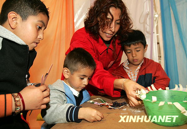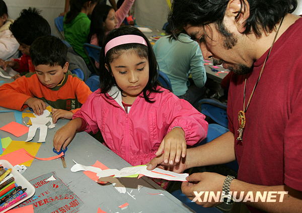 10月18日,在墨西哥城舉辦的墨西哥第八屆圖書節(jié)上,輔導(dǎo)老師(右)指導(dǎo)孩子們練習(xí)剪紙。