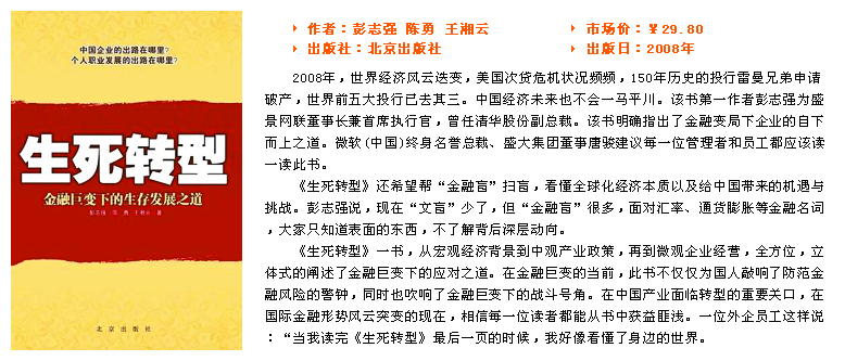 瘋狂的糧價(jià):全球漲3倍,中國(guó)怎么辦? 瘋狂的石油價(jià)格:四年漲七倍 中長(zhǎng)期通貨膨脹趨勢(shì):生死抉擇只在一念間? 通貨膨脹的副產(chǎn)品:銀根緊縮與資金成本上升 金融變局下的企業(yè)經(jīng)營(yíng)最高法則