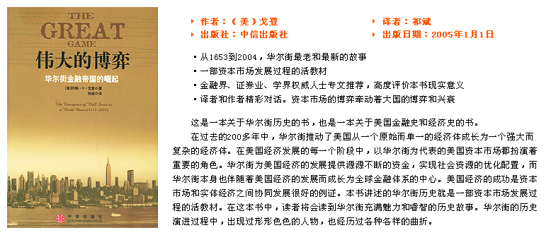《偉大的博弈》是一部講述以華爾街為代表的美國資本市場發(fā)展歷史的著作。這本書以華爾街為主線展示了美國資本市場發(fā)展的全過程。它生動地講述了華爾街從一條普普通通的小街發(fā)展成為世界金融中心的傳奇般的歷史,展現(xiàn)了以華爾街為代表的美國資本市場在美國經(jīng)濟(jì)發(fā)展和騰飛過程中的巨大作用。書中大量的歷史事實和經(jīng)濟(jì)數(shù)據(jù),讓我們可以更全面和準(zhǔn)確地認(rèn)識美國資本市場的發(fā)展過程。 從世界范圍看,資本市場的產(chǎn)生和發(fā)展是與社會化大生產(chǎn)緊密相連的。從馬克思有關(guān)虛擬經(jīng)濟(jì)的論述,到后來產(chǎn)生的各種經(jīng)濟(jì)學(xué)理論,都對資本市場在現(xiàn)代經(jīng)濟(jì)中的作用進(jìn)行過不同角度的闡述。在現(xiàn)代經(jīng)濟(jì)生活中,資本市場不僅提供了企業(yè)籌集資本的場所,也是實現(xiàn)社會資源配置的工具;并且還起到完善公司治理結(jié)構(gòu)的重要作用。 了解華爾街的歷史,能使我們對于美國如何在兩百多年的時間里,從一個殖民地成為世界超級大國這一轉(zhuǎn)變的歷史原因增加了認(rèn)識。在美國經(jīng)濟(jì)的發(fā)展過程中,華爾街在不同的歷史時期承擔(dān)了不同的歷史使命,它支撐了美國聯(lián)邦政府在南北戰(zhàn)爭中的戰(zhàn)爭融資,推動了美國由鐵路帶來的第一次重工業(yè)化浪潮,擴(kuò)大了美國在兩次世界大戰(zhàn)中獲得的巨大經(jīng)濟(jì)利益,也實現(xiàn)了美國在上世紀(jì)八十年代后向新經(jīng)濟(jì)成功轉(zhuǎn)軌的進(jìn)程。 回顧歷史,尤其是最近一百年的歷史,華爾街的作用在不斷豐富和深化,投資人在華爾街追逐自身利益的同時,"看不見的手"實現(xiàn)了社會資源的高效率配置。尤其是在知識經(jīng)濟(jì)時代,資本市場將知識和經(jīng)濟(jì)緊密地結(jié)合起來,推動著美國科技的飛速發(fā)展,使美國在當(dāng)今激烈的國際競爭中,在具有戰(zhàn)略意義的科技領(lǐng)域里始終保持著領(lǐng)先地位。 處在關(guān)鍵戰(zhàn)略期的中華民族,面臨著實現(xiàn)偉大復(fù)興的歷史使命。黨的十六大做出了全面建設(shè)小康社會的戰(zhàn)略部署,這是一項涉及社會各個方面和各個領(lǐng)域的龐大系統(tǒng)工程。以史為鑒,世界歷史發(fā)展的經(jīng)驗揭示了資本市場在國家發(fā)展過程中的重要作用。一個健康、高效和穩(wěn)定的資本市場,有利于提高社會資源的利用水平和經(jīng)濟(jì)的運行效率,實現(xiàn)可持續(xù)發(fā)展,增強一個國家的綜合國力。黨中央、國務(wù)院深刻地認(rèn)識到了資本市場的重要作用,將大力發(fā)展資本市場作為一項重要的戰(zhàn)略任務(wù)。我國的資本市場發(fā)展到今天,已經(jīng)取得了巨大的成就,為社會主義建設(shè)作出了巨大的貢獻(xiàn)。面對新的形勢和歷史使命,如何進(jìn)一步推進(jìn)資本市場改革開放和穩(wěn)定發(fā)展,更好地服務(wù)于全面建設(shè)小康社會的宏偉目標(biāo),是當(dāng)前擺在我們面前的一個迫切的課題! 黨的十六大提出要推進(jìn)資本市場改革開放和穩(wěn)定發(fā)展。當(dāng)前,我國證券市場的發(fā)展面臨良好的機遇和條件,全面建設(shè)小康社會需要資金投入,居民儲蓄的大幅增長以及社會保障體系的建立和完善必然伴生投資需求,這兩方面的需求為我國資本市場提供了巨大的發(fā)展空間。我國是正處于轉(zhuǎn)軌階段的發(fā)展中國家,優(yōu)化結(jié)構(gòu)和提高效益是我國經(jīng)濟(jì)發(fā)展的重要內(nèi)容,集中統(tǒng)一的證券市場對于打破要素市場分割,實現(xiàn)資源的跨行業(yè)、跨地區(qū)、跨產(chǎn)業(yè)優(yōu)化配置具有特殊作用。 我國的投融資體制目前仍以間接融資為主導(dǎo),金融體系中直接融資比例的增加,將有利于優(yōu)化金融資源配置,分散金融體系的風(fēng)險,提高金融體系對國民經(jīng)濟(jì)的服務(wù)效率。國有企業(yè)改革繼續(xù)深化,需要證券市場進(jìn)一步發(fā)揮培育和規(guī)范上市公司等市場主體的功能,并對國有企業(yè)改革發(fā)揮示范和帶動作用。穩(wěn)健的財政政策要帶動民間投資,穩(wěn)健的貨幣政策需要關(guān)注證券資產(chǎn)價格和證券市場的流動性需求,證券市場對宏觀政策的作用機制和效果具有重要的影響! 作為體制轉(zhuǎn)軌時期的新興市場,我國證券市場發(fā)展中還存在一些亟待解決的矛盾和問題,影響證券市場的穩(wěn)定運行和功能發(fā)揮。比如,市場主體的治理結(jié)構(gòu)尚不規(guī)范,影響市場透明度和規(guī)范化運作水平;市場結(jié)構(gòu)和功能還不健全,影響了資源配置效率;一些歷史遺留問題尚未解決,影響投資者的信心。借鑒國外成熟市場的做法,將有助于我們尋找解決當(dāng)前這些問題的答案。正如馬克思主義理論所揭示的那樣,矛盾是事物存在的特征之一。華爾街的成長也不是一帆風(fēng)順的,在發(fā)展的過程中也遇到各種問題。在早期的華爾街,市場坐莊、上市公司欺詐、內(nèi)幕交易等等層出不窮,政府官員的腐敗、國民經(jīng)濟(jì)的周期波動和戰(zhàn)爭都給資本市場帶來了接連不斷的沖擊。但是,華爾街最終能夠成長為一個成熟的金融市場,并最終成為全球金融中心之一,最重要的原因在于它遵