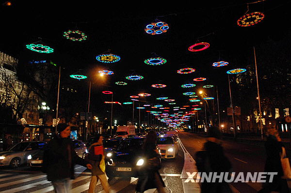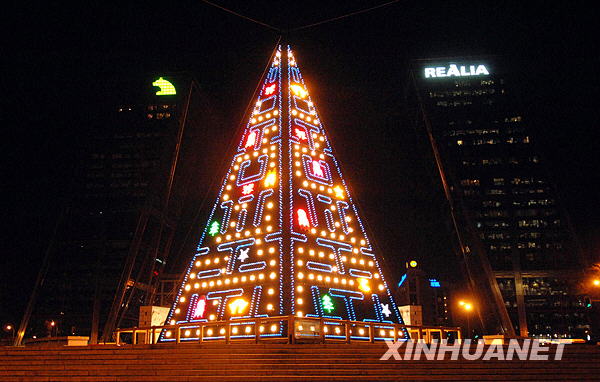 這是12月2日拍攝的西班牙首都馬德里著名建筑歐洲門前的圣誕樹燈飾。