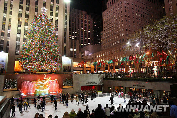 12月7日,一些游客在美國紐約洛克菲勒中心前巨大的圣誕樹下溜冰。洛克菲勒中心的圣誕樹號(hào)稱全美最有名的圣誕樹。今年選中的圣誕樹是一棵77年樹齡的挪威云杉,高約22米,裝飾有彩燈和一顆巨大的水晶星。隨著圣誕節(jié)的臨近,紐約各處的景點(diǎn)、商場(chǎng)和社區(qū)紛紛裝扮成一年中最靚麗的模樣,吸引廣大市民和游客前來參觀。