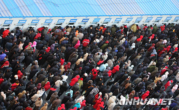 1月12日是2009年春運(yùn)的第2天,鐵路北京西站迎來(lái)購(gòu)票高峰,廣場(chǎng)上的售票區(qū)人山人海。