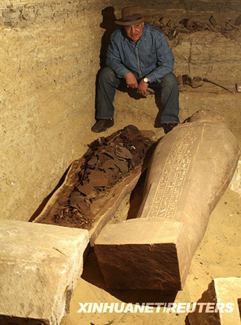 這張由埃及最高文物委員會2月9日公布的照片顯示,該委員會主席扎希·哈瓦斯坐在一具新出土的木乃伊旁。新華社/路透埃及考古學家當天表示,他們在首都開羅以南塞加拉地區(qū)一座有2600多年歷史的墳墓中發(fā)現(xiàn)了20多具木乃伊。該墳墓可追溯至公元前640年,正值第26王朝時期。新華社/法新