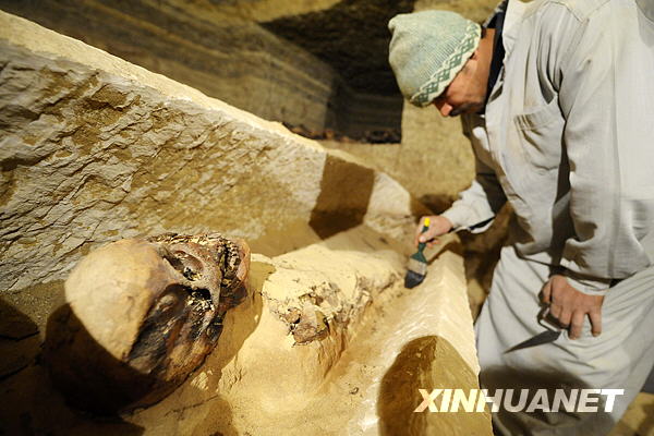 2月11日,在埃及開羅以南的塞加拉地區(qū)的墓地中,工作人員清理一具木乃伊身上的塵土。當(dāng)日,埃及最高文物委員會(huì)主席扎!す咚乖谶@個(gè)墓地中打開了一具新發(fā)現(xiàn)的古埃及石棺,并從中找到一具保存完好的木乃伊。埃及考古學(xué)家此前在這個(gè)位于塞加拉地區(qū)著名的階梯金字塔西南的墓地中發(fā)現(xiàn)了木乃伊、木棺和石棺等文物共30件,這些文物的歷史可追溯到2600年前。