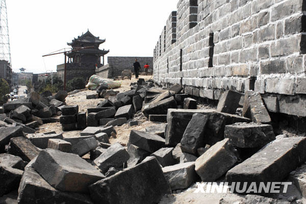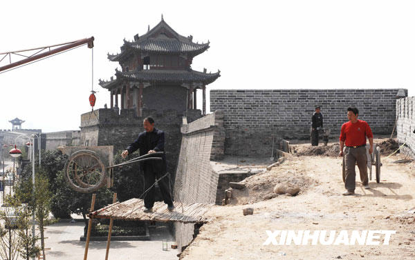 3月15日拍攝的襄陽(yáng)古城墻修復(fù)施工現(xiàn)場(chǎng)。經(jīng)國(guó)家文物局批準(zhǔn),湖北襄樊市對(duì)國(guó)家重點(diǎn)文物保護(hù)單位襄陽(yáng)古城墻小北門(mén)至荊州古治段的447.2米的古城墻進(jìn)行維修。維修工程主要包括對(duì)坍塌墻體和豁口處進(jìn)行恢復(fù)、內(nèi)外墻護(hù)坡加固、恢復(fù)垛堞、鋪設(shè)游路等。