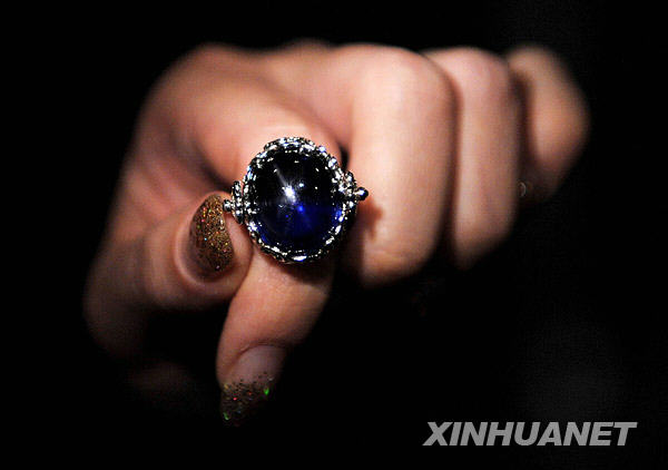 3月26日,模特在展示鑲有32.84克拉天然雙蛋面雙星光緬甸藍寶石的指環(huán)(估價達260萬至330萬港元)。