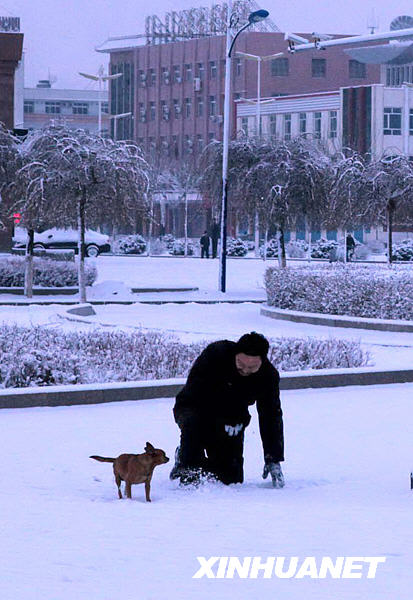 3月30日清晨,一位烏蘭浩特市民在雪中遛狗。新華社發(fā)(李德 攝)