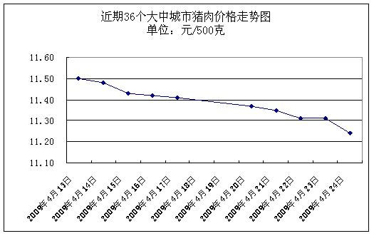 據(jù)國家發(fā)展改革委價(jià)格監(jiān)測中心監(jiān)測,上周36個(gè)大中城市集市、超市豬肉(精瘦肉)平均零售價(jià)格每500克為11.32元,與前一周(2009.4.13-2009.4.17,下同)相比下降1.14%。