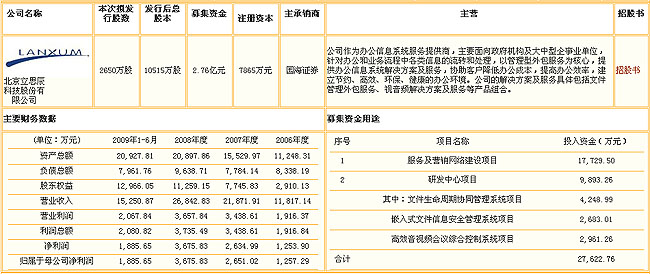 北京立思辰科技股份有限公司主營文件管理外包服務(wù),注冊時間為1999年1月8日。公司董事長池燕明90年代初就開始從事復(fù)印相關(guān)的服務(wù)和產(chǎn)品銷售。根據(jù)公開資金顯示,立思辰在2004年之前主要從事復(fù)印機(jī)的代理銷售。 但是由于行業(yè)競爭激烈、利潤率降低,2004年之后公司借鑒國外文件管理外包的模式,轉(zhuǎn)型做一家服務(wù)性企業(yè)。模式就是企業(yè)將打印服務(wù)業(yè)務(wù)交給專業(yè)的服務(wù)提供商,進(jìn)行"按需打印、按張收費(fèi)",企業(yè)無須購買設(shè)備,而專業(yè)的服務(wù)商通過一系列技術(shù)手段,監(jiān)控所有的設(shè)備,提供全面的設(shè)備運(yùn)營管理,幫助企業(yè)節(jié)省費(fèi)用以及提高效率。 招股說明書顯示,公司近年處于快速成長階段。2006-2008年度營業(yè)收入分別為11817萬、21871萬、26842萬,復(fù)合增長率為50.72%;公司2006-2008年度凈利潤分別為1253萬、2694萬、3675萬,復(fù)合增長率為71.22%。 2009年上半年,公司銷售收入和利潤分別為15250萬和1885萬;不過招股說明書為提供08年同期的數(shù)據(jù)。 公司的辦公信息系統(tǒng)解決方案及服務(wù)客戶主要是于政府機(jī)構(gòu)和多個行業(yè)的大中型企事業(yè)單位。 招股說明書顯示,2009年上半年,公司前五大客戶為內(nèi)蒙庫勞動和社會保障廳、國家統(tǒng)計與、民生銀行(6.65,-0.11,-1.63%)、中石油(13.18,-0.23,-1.72%)西氣東送管道分公司、北京匯成嘉和科技有限公司,五大客戶占銷售總額的29.48%。 2008年公司的市場占有率為6.1%,居第二的位置,第一位的富士施樂市場占有率為17.04%。