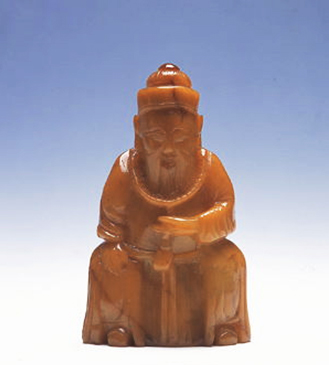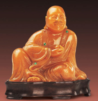 "黃金易得,田黃難求。"此件依田黃石材料巧妙雕制成羅漢像,光頭﹑坦胸﹑一手扶地,一手捧佛珠,身披袈裟,上嵌寶石,神情肅然,舉止端莊。刻工流暢﹑精致,入手極感舒暢,撫摩久之,則益加不忍釋手,心﹑石相契?芍^"田石羅漢無(wú)量壽,來(lái)結(jié)人間百歲緣。"